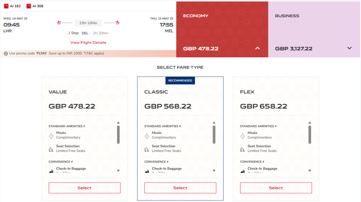 Air India mají ekonomickou, business i první třídu. V porovnání s ostatními leteckými společnostmi je ale First Class Air Indie hodnocená spíše negativně a často připomíná business třídu jiných prémiových aerolinek.