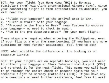 Ahoj, já se na něco podobného ptala na chatu, letím v únoru. Lety mám na jedné rezervaci a abych se vyhla Manile, tak s tří hodinovým přestupem letím přes Clark. Check in online budu mít. Uložila jsem si přepis chatu s BOTem, přikládám.