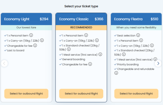 Jednotlivé třídy se dále dělí do tarifních skupin, které se liší například povoleným počtem zavazadel, možností změn letenek nebo výběrem konkrétní sedačky zdarma.