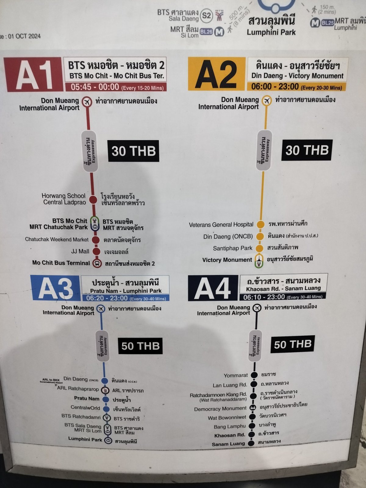 Autobusy zastavují před mezinárodním terminálem u východu číslo 6. Z vnitrostátního terminálu vás k zastávce dovede přehledné značení asi za 5 minut chůze. Na letišti Suvarnabhumi pak autobusy zastavují u východu číslo 3 v příletovém patře.