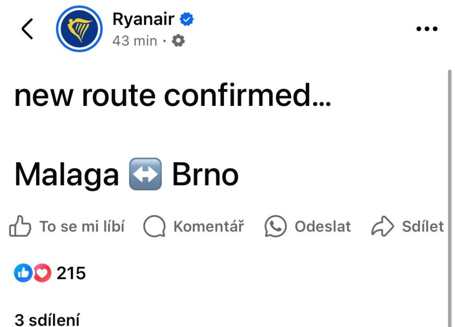 Brno-Malaga je v běžném prodeji už snad kolem půl roku. Tohle spíš bude info o tom, že bude létat i přes zimní letový řád, což je relativní novinka? Obecně jsou tahle oznámení na FB Ryanairu často dost random.
