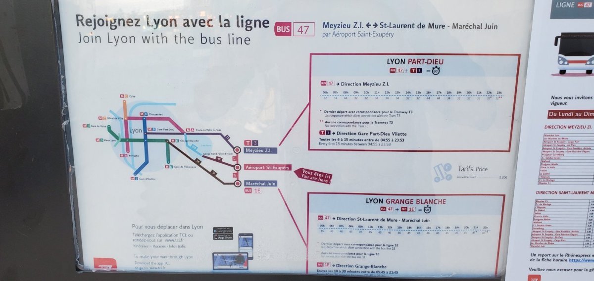 Bus č. 47 jezdí jednou za 30 min. a u řidiče jsem si koupil papírovou jízdenku za 2,50 EUR, na kterou jsem s přestupem na tramvaj T3 dojel až do centra. Tam jsem si poté koupil za 13,10 EUR jízdenku na TCL na 48 hod, na kterou jsem použil pro cestu zpět na letiště při odletu domů. Byl jsem v Lyonu méně než 48 hod a chtěl jsem si proto koupit při příletu na letišti jen jednu jízdenku na 48 hod, ale nepodařilo se to. Paní na Ičku na letišti mi svou lámanou angličtinou vysvětlila, že to nejde/nebo jsem jí tak alespoň pochopil. Použít tramvaj Rhoneexpres za cca 17,- EUR nedává smysl.