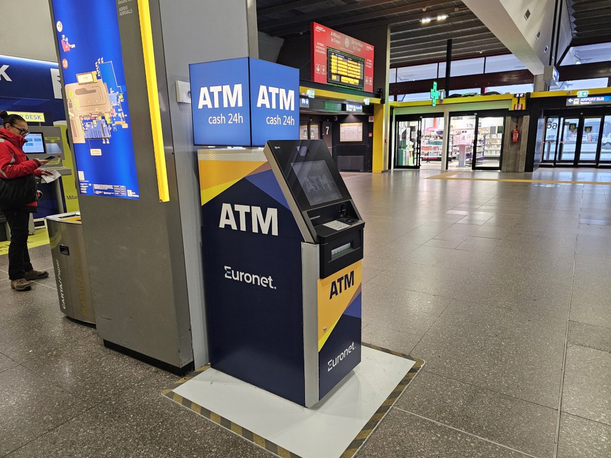 Bankomaty jsou k dispozici na mnoha místech v příletové hale i u stanice vlaku.