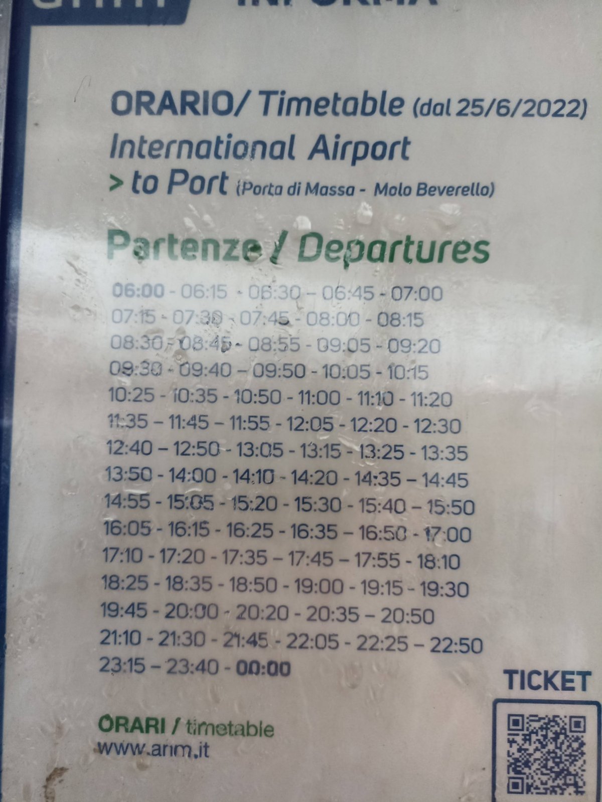 Jen doplním, že Alibus už stojí 5€ i v Sun Store trafice, takže sleva se nekoná... Jinak Alibus v pohodě, doporučuju vystupovat spíš až druhou zastávku (Port Massa), protože je trochu blíž centru. Pozor na to, že Alibus je prťavej bus, takže když se lidi dovnitř nevejdou, prostě odjede a fronta čeká na další. Alternativy moc nejsou, ale jezdí to po cca 15 - 20 minutách, takže se to dá vydržet.