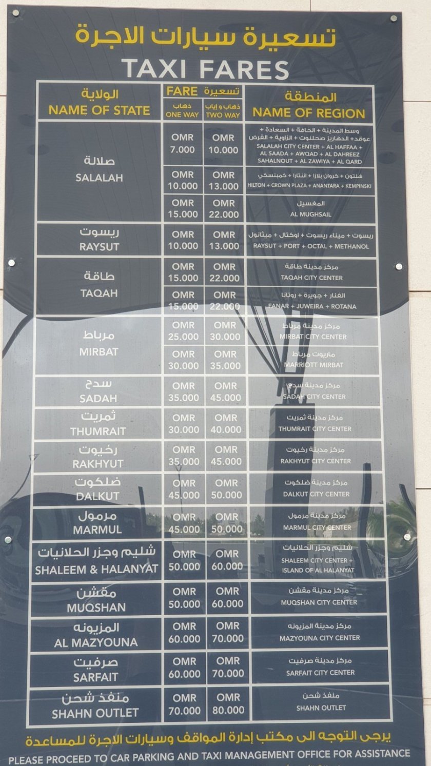 Bohužel zde vládne taxikářkská mafie. Otaxi sem oficiálně nesmí. Pokud si otaxi objednáte vezme ho s nejvyšší pravděpodobností někdo z čekajících taxíků a vysvětlí vám osobně nebo přes WhatsApp, že pojedou jen za ceny na tabuli, co je před letištěm: například do hotelu Fanar chcou 15OMR (nebo 45EUR, ukecáno na 40 EUR). Pokud budete mít štěstí, ozve se vám přes WhatsApp i nějaký jiný taxikář a třeba cenu o pár riálu ukecáte. Za pobyt v Salalahu jsme narazili na jediného férového taxikáře - ten nás vezl nazpět na letiště za 6 OMR. WhatsApp - +968 9859 0387.