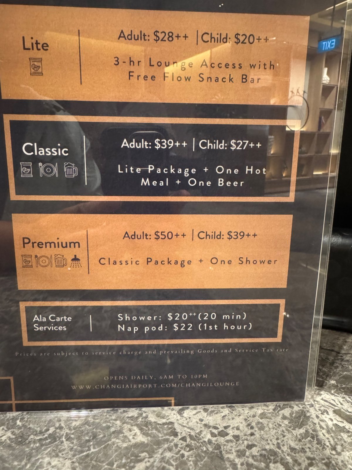 - Terminál 3 – tranzitní zóna, Ambassador Transit Lounge, otevřeno 24/7, vstup 68 SGD na 3 hodiny (kompletní využití salonku)