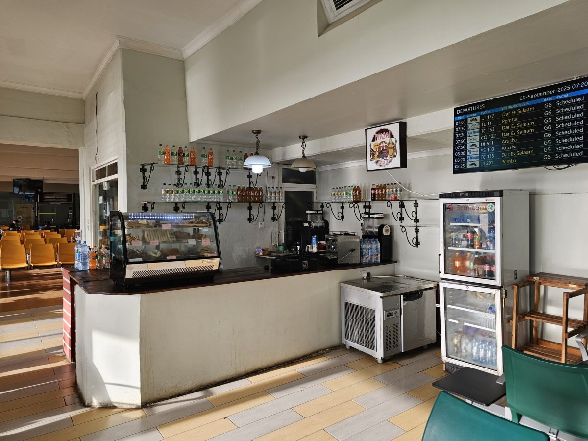 V mezinárodním terminálu najdete po bezpečnostní kontrole restauraci, bar a menší bistro. Ceny jsou zde několikanásobně vyšší než kdekoliv jinde na Zanzibaru.