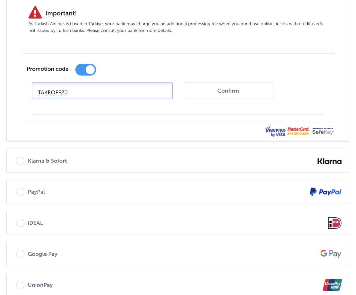 Promo kód u aerolinií Turkish Airlines uplatníte až na finální stránce s platbou.