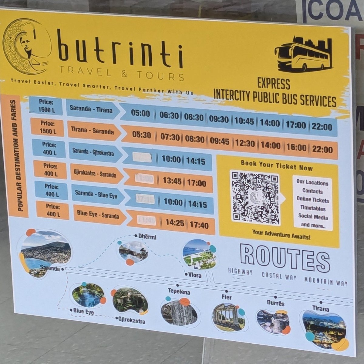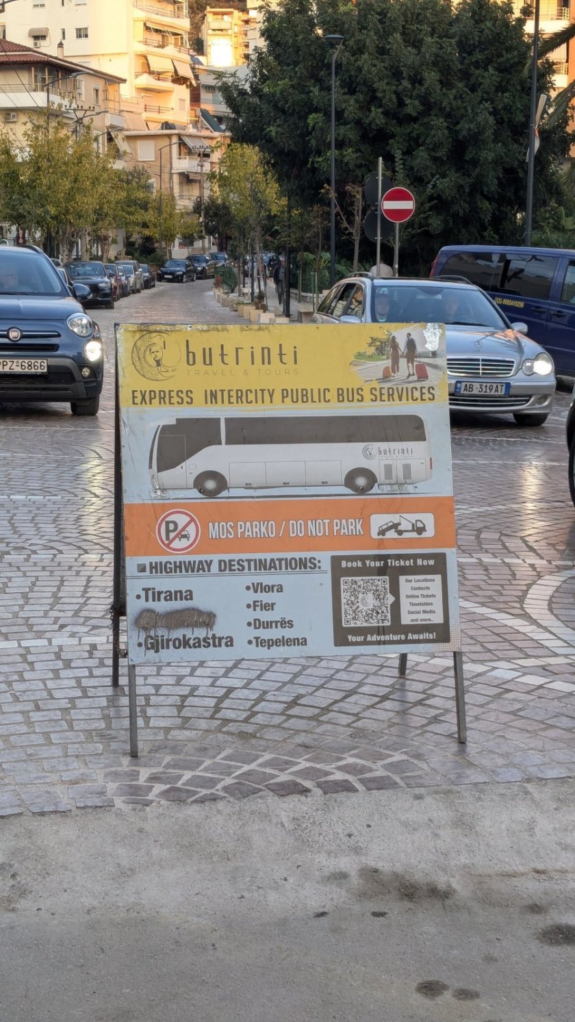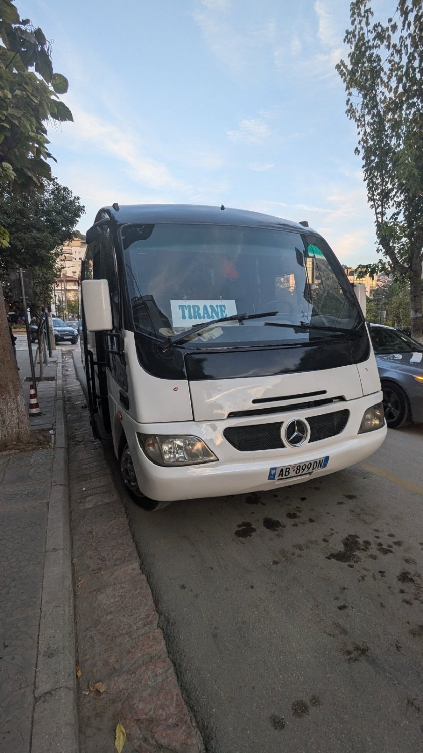- několikrát denně přímý bus. Cena 1500 LEK nebo vydřidušský kurz 17 EUR - pouze v hotovosti. Lze i online, ale vždy si musíte pro papírovou jízdenku k přepážce v dostatečném předstihu. V Tiraně zastavuje jen na jižním terminálu na okraji. Jezdí 2 trasy - buď klasické velké busy podél pobřeží nebo malé napřímo. I tak počítejte s jízdní dobou 5-7 hodin dle provozu.