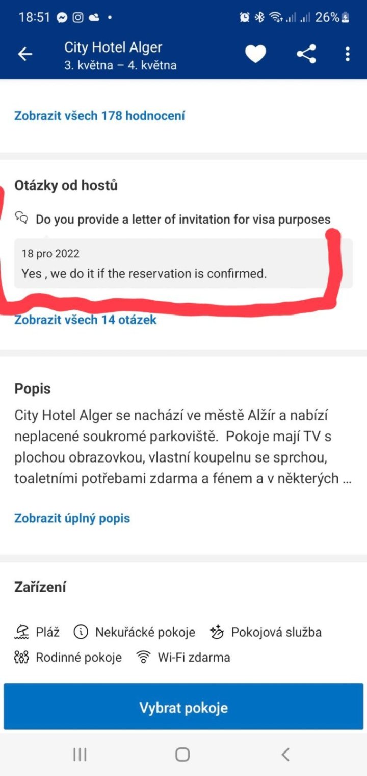 - potvrzení rezervace hotelu nebo pozvání od osoby, která zve žadatele do Alžírska