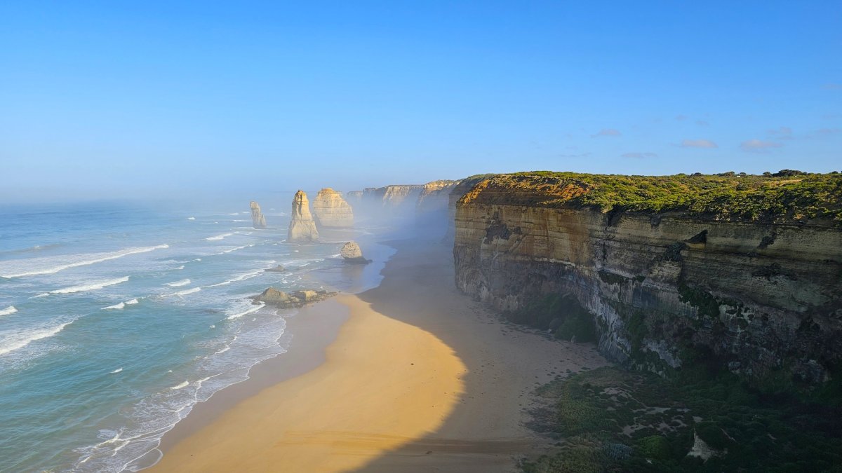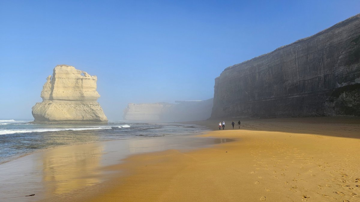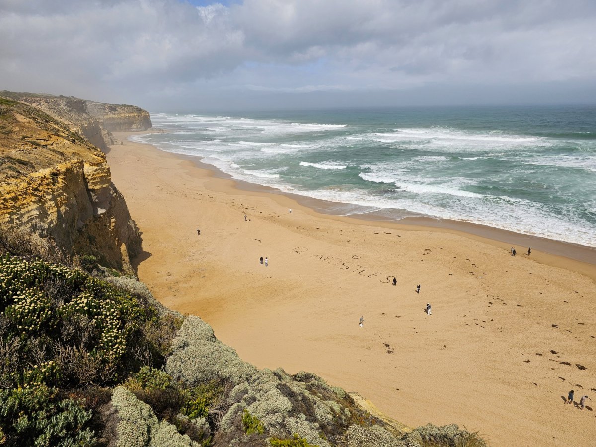 Zhruba 800 metrů od informačního centra můžete po Gibsonově schodišti sejít až úplně dolů k moři na širokou písečnou pláž a užít si Twelve Apostles ze zcela jiné perspektivy.
