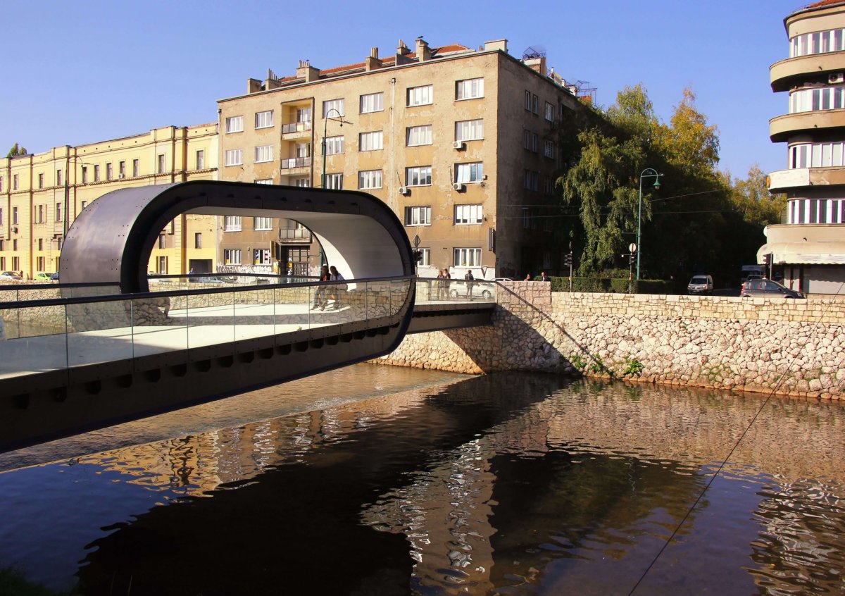 Latinské přísloví „Festina lente“, tedy „Pospíchej pomalu“ adoptoval za svůj název architektonicky zajímavý most pro pěší spojující Staré město s Akademií výtvarného umění, jejíž tři studenti most navrhli. Uprostřed nad korytem řeky Miljacky vytváří smyčku jako na horské dráze, která slouží zároveň jako přístřešek a zároveň jako místo k posezení. Nabádá pěší, aby se v dnešním uspěchaném světě na chvilku zastavili a užili si pěkného výhledu na…