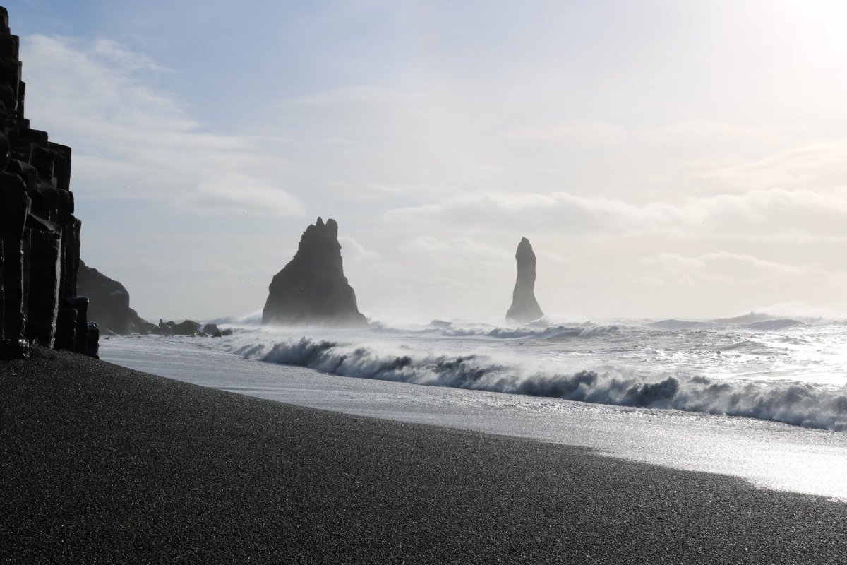 Na pozadí "za rohem" pláže se pak můžete kochat působivými a až 60 metrů vysokými skalisky Reynisdrangar, které doslova trčí z oceánu zhruba 100 metrů od břehu.