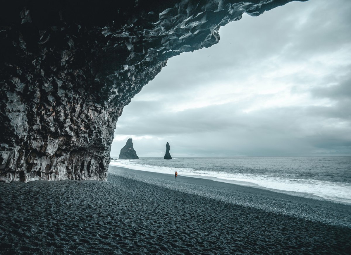 Reynisfjara je asi nejznámější islandská pláž s temně černým sopečným pískem a impozantními kulisami útesů, jeskyní, skal a svěže zelených luk.
