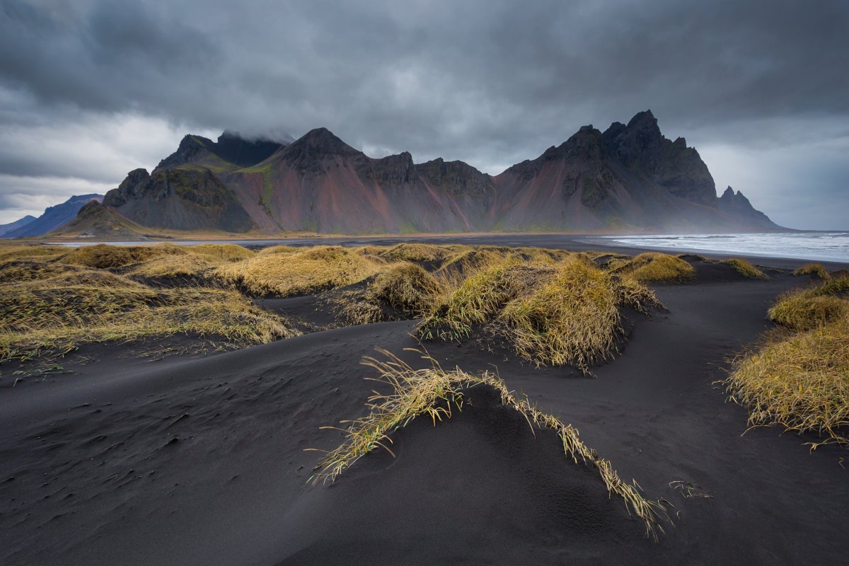 Nejkrásnější pohledy na celistvé pohoří Vestrahorn se naskytnou z blízké pláže Stokksnes. Ta je už sama o sobě zajímavá sytě černě zbarveným pískem s obrovskými trsy trávy.