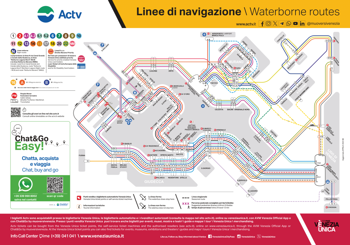 Kanceláře s obsluhou dopravního podniku ACTV jsou dostupné na nádraží Mestre, Santa Lucia a na Piazzale Roma v Benátkách.