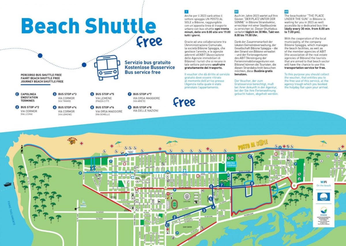 - Beach Shuttle – spojuje severní část Bibione s obytnými zónami na západě města a pláží Bibione u Posto del Sole (konečná Via Colonia/CIF)