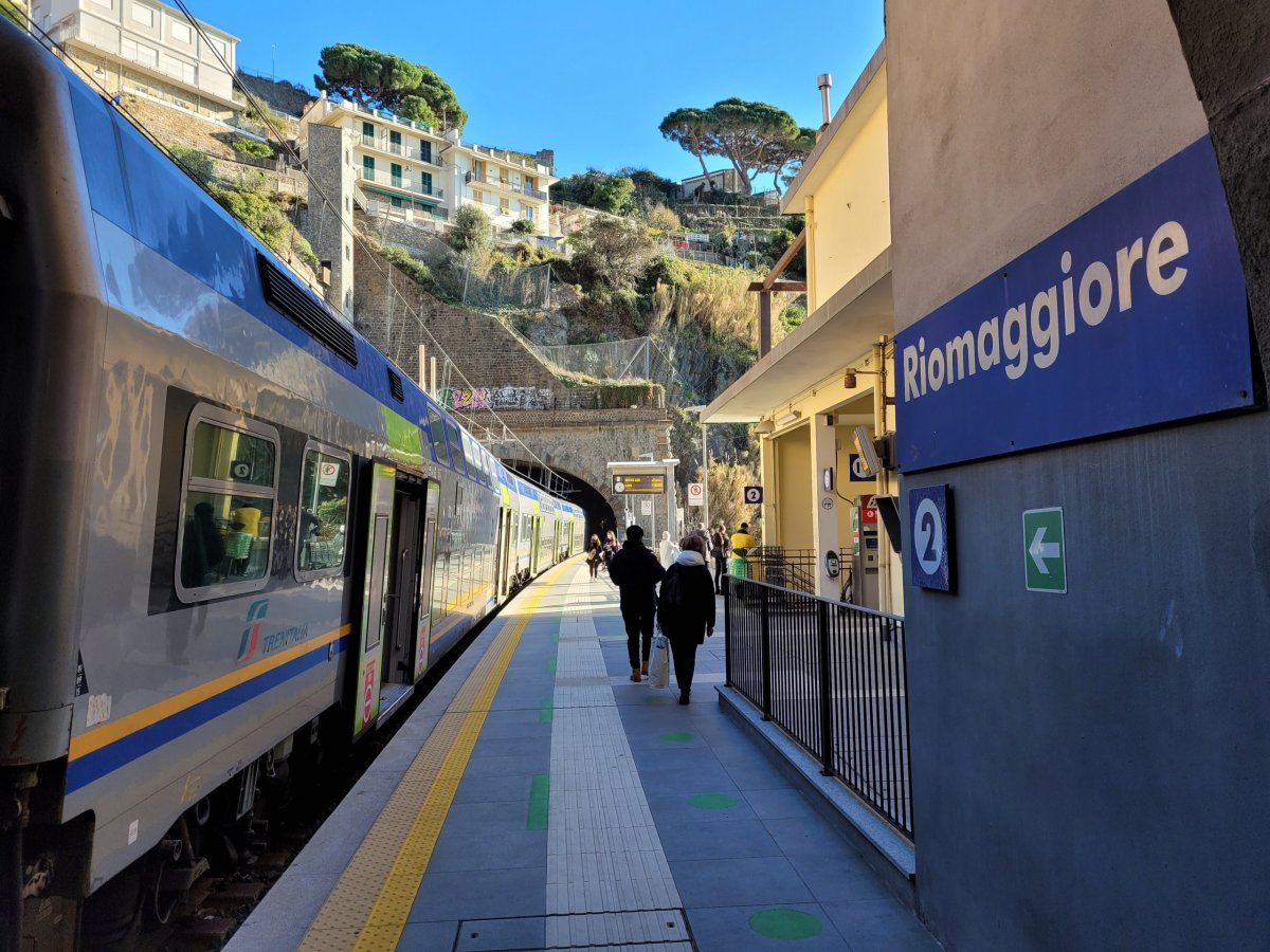 Do všech obcí na Cinque Terre se dostanete hlavně vlakem, trať je zde většinou zanořená do tunelů, stejně jako nádraží Riomaggiore. Nástupiště začíná v jednom tunelu, pokračuje přes asi 200metrový venkovní úsek s nádherným výhledem na moře a konec se noří do druhého tunelu.