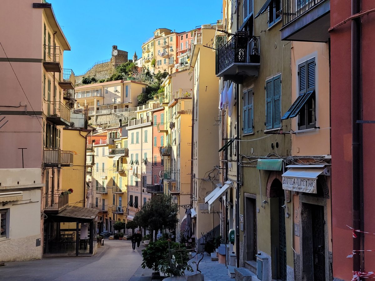 Hlavní třída Riomaggiore je obklopená až 5patrovými domy a velmi strmě stoupá od moře s betonovým molem pro spouštění lodí až do venkovských oblastí plné strmých svahů s vinnou révou.