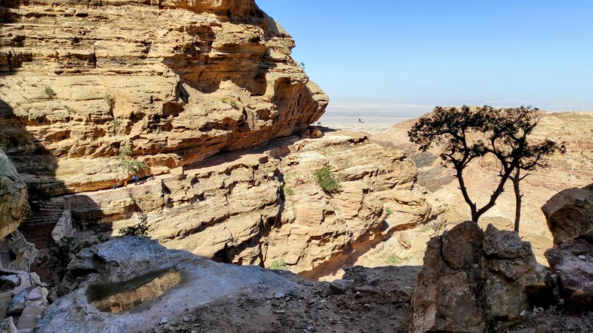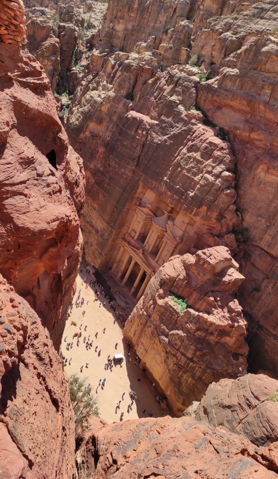 Po těchto zkušenostech, pokud bych měla jen jeden celý den na Petru a měla se rozhodnout jakou trasu jít, šla bych z Malé Petry (jeepem za 5 bych si to zkrátila) směrem k Visitor centru se zacházkou na vyhlídku nad Pokladnicí (mapy.cz - cíl "Treasury from above"). Nahoře napravo od stezky cca 50 m před konečnou (stanem), jak je ustájený oslík, je tento výhled na Pokladnici - viz fotka, popř. ještě před oslem cca 100 m se můžete oddělit od cesty (vpravo) a na skále udělat piknik s tímto výhledem taky (zavedl nás sem jeden beduínský chlapec, co se seznámil s našimi dětmi, jinak by nás to nenapadlo a šli bychom jako všichni ostatní až na konec stezky ke stanu s placeným výhledem). Nemusíte tak jít do stanu nahoře na konci cesty kvůli výhledu (výhled mají zakrytý stanem a do něho vás nepustí bez zakoupení pití).
