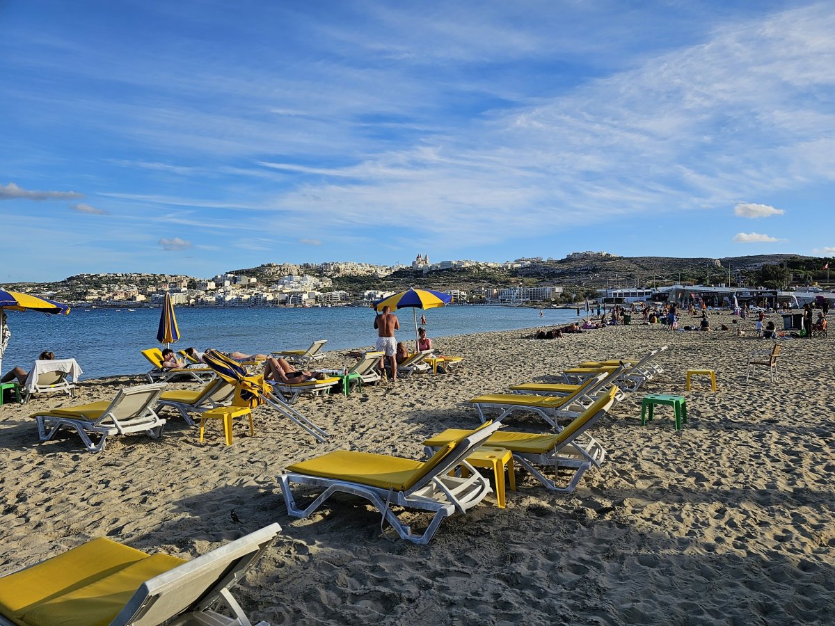 Pláž Ghadira je podobně drahá jako ostatní pláže na Maltě. Za set 2 lehátek a slunečníku zaplatíte zhruba 17 EUR na den.