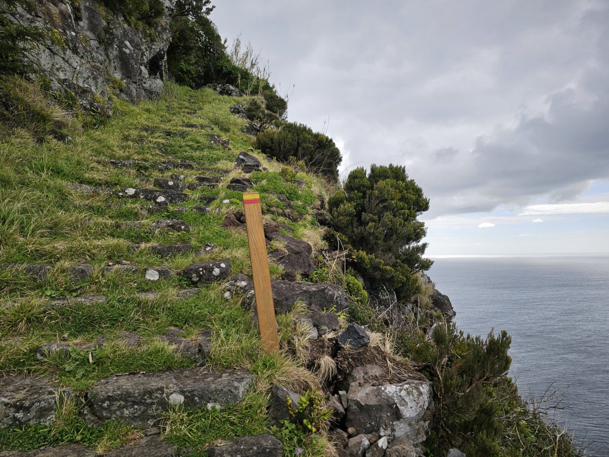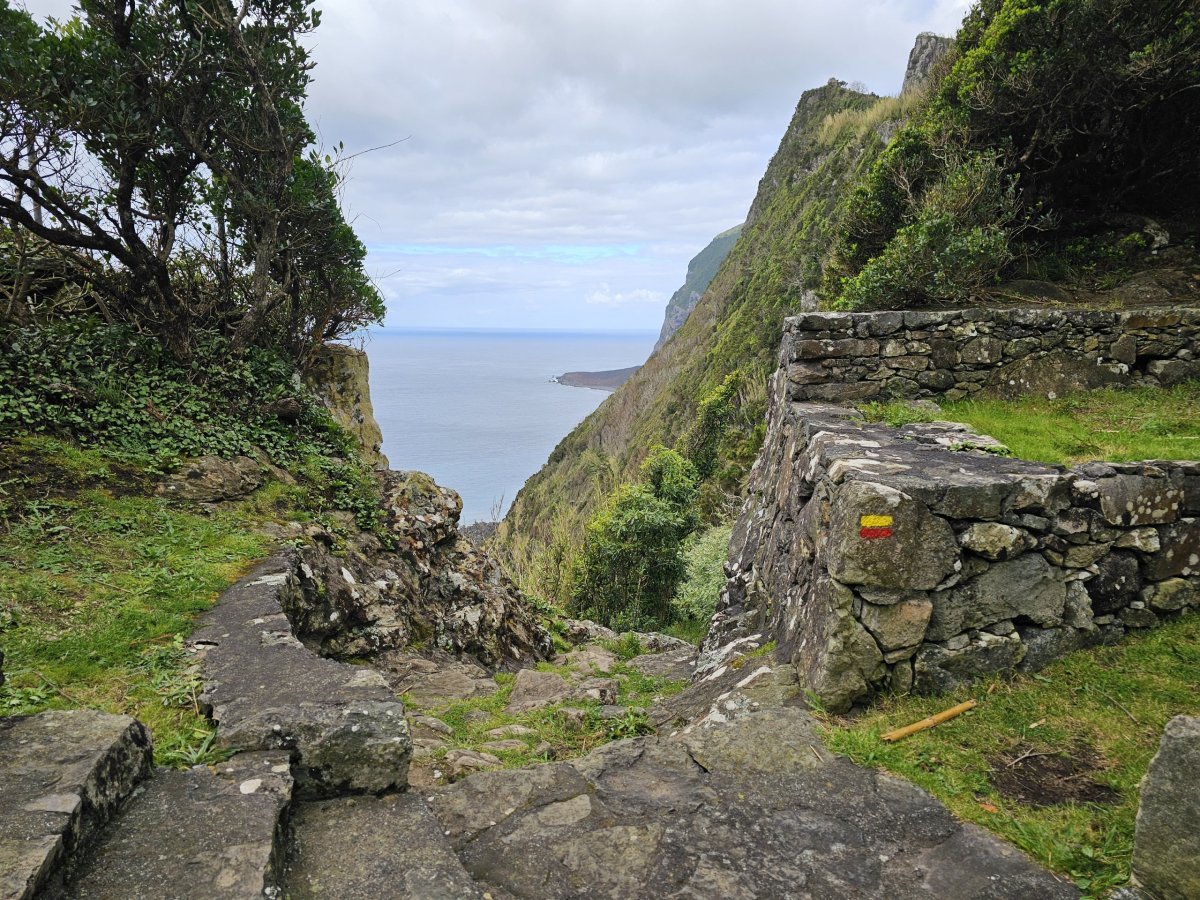 Stezka vede podél útesu, kterým v serpentinách a vytesaných schodech klesá až úplně dolů k mořské hladině.