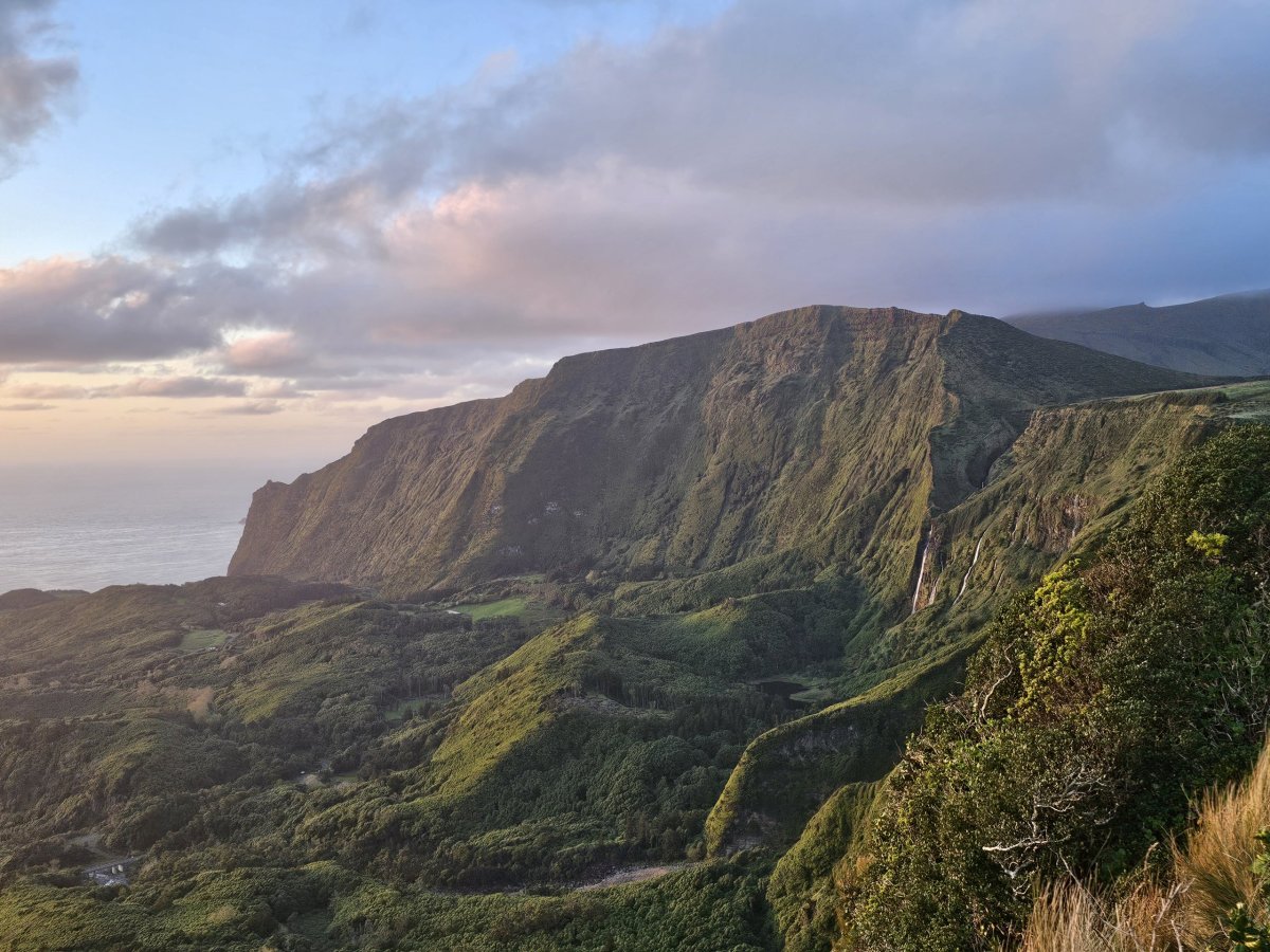 Ráno a dopoledne je sluncem krásně nasvícené údolí s vesnicí Fajãzinha a širý Atlantský oceán.