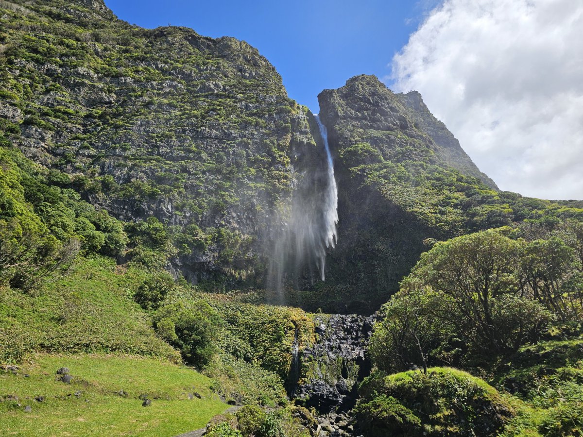 Cascata do Poço do Bacalhau je nejlépe přístupný vodopád a tvoří nádhernou dominantu pobřeží v těsné blízkosti městečka Fajã Grande.