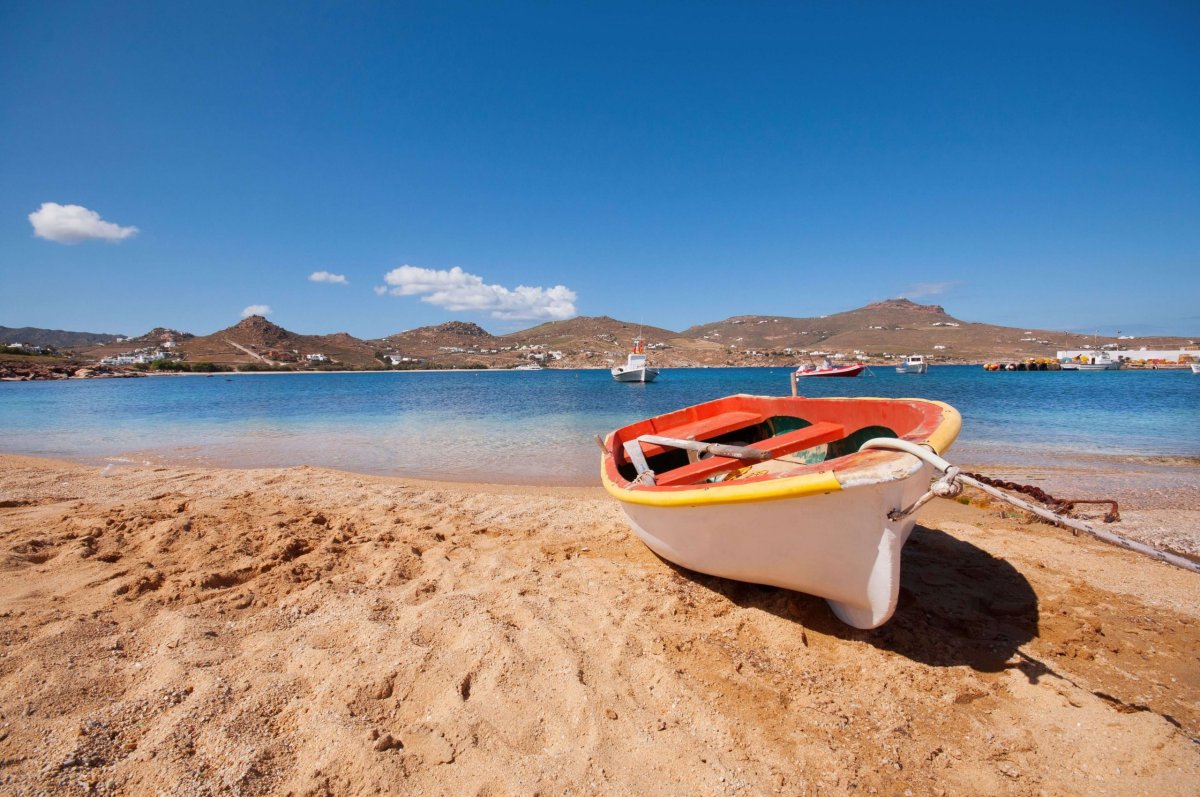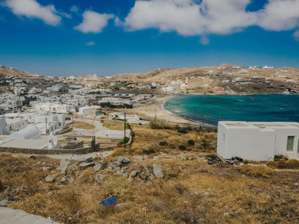 Nejdelší pláž na Mykonosu. Nabídne slunečníky, lehátka, bary, taverny i sportovní aktivity. Dostanete se sem ze Starého přístavu autobusem nebo z Platys Gylos lodí.