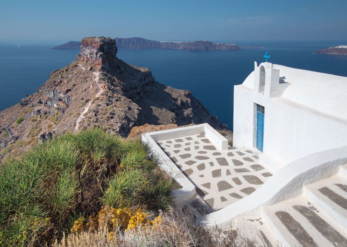 Nejkrásnější výhledy se naskytnou hned při sestoupení po schodech z Imerovigli s malou kapličkou v popředí.