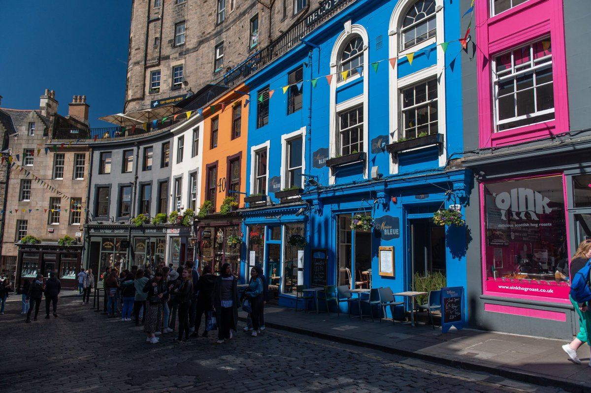 - Z Grassmarketu: ulice začíná v pravém rohu náměstí, kde najdete ikonické pestrobarevné domy.