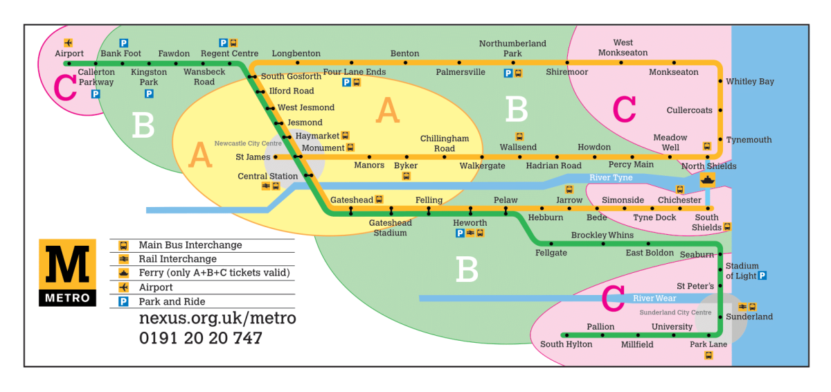 Síť metra "Tyne and Wear" čítá celkem 78 km tratí a 2 linky. Žlutá trasa se však klikatí a vytváří okružní trasu tak, že pokryje obrovskou část města a de facto se jedná o dvě různé trasy.