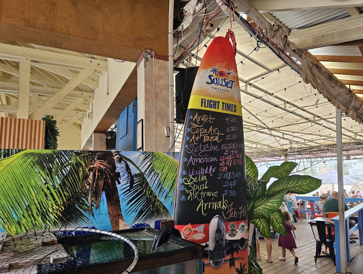 Přímo v baru je nainstalovaná obrazovka s aktuálními přílety a odlety i slavné surfařské prkno, na které obsluha každé ráno vypisuje přílety velkých letadel.