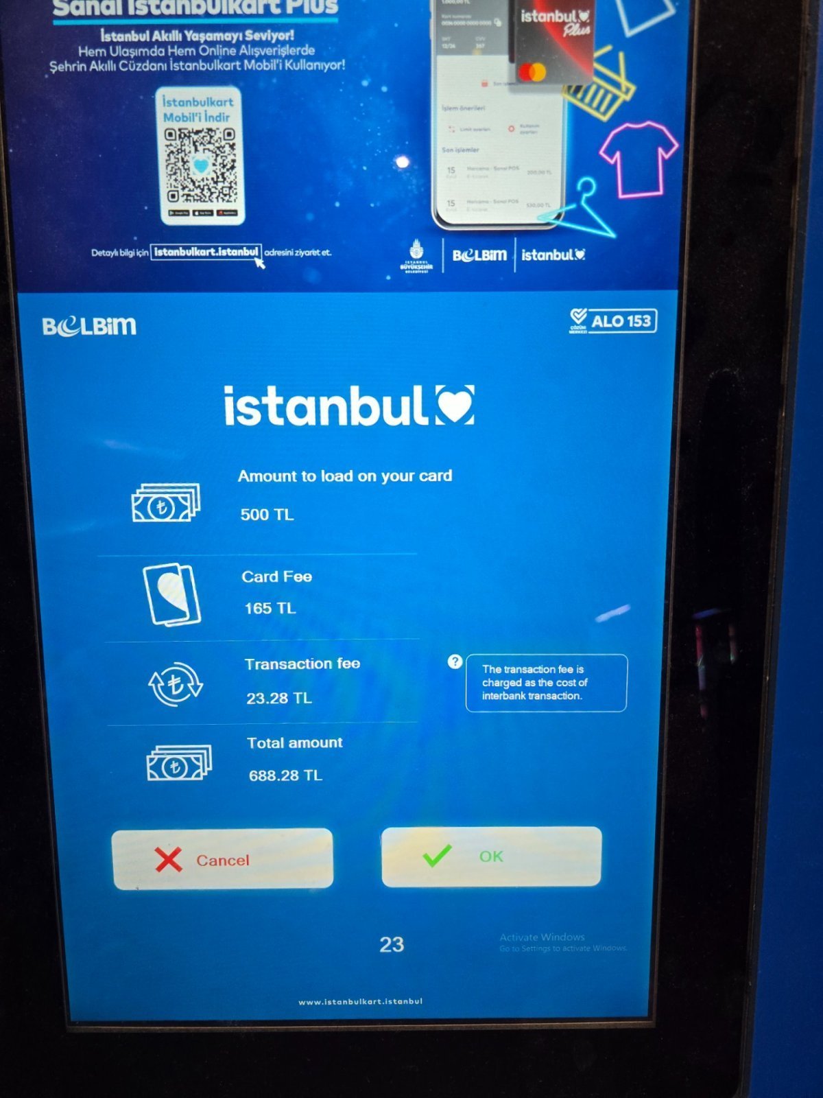 Cena za istanbulkart je 165 TRY. Měsíční limit na istanbulkart je 2750 TRY. Jízdné se dá platit i platební kartou, ale třeba v metru turniket strhne 40 TRY při platbě kartou, což odpovídá ceně za One Pass - disposable card. Pro nízké jednotky jízd se může vyplatit, jinak istanbulkart. Automaty na istanbulkart na možnost "platby kartou" upozorňují, ale nespecifikují cenu, tak se nenechte zmást a kupte si tu kartu. Poplatek za dobití istanbulkart z platební karty bude asi úměrný dobíjené částce - pro 500 TRY a kartu mi to naúčtovalo 23.28 TRY.