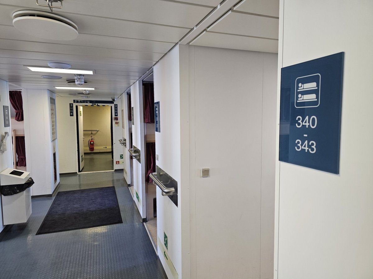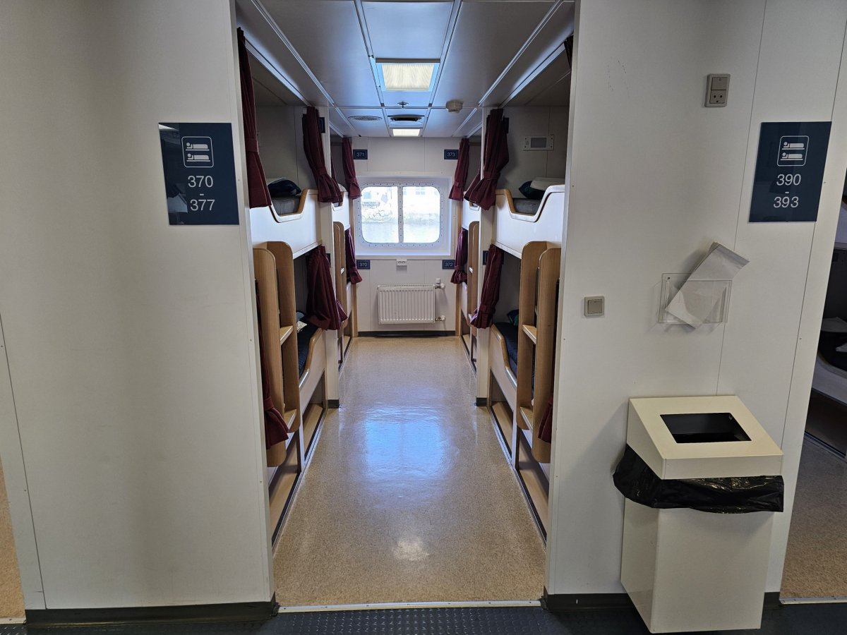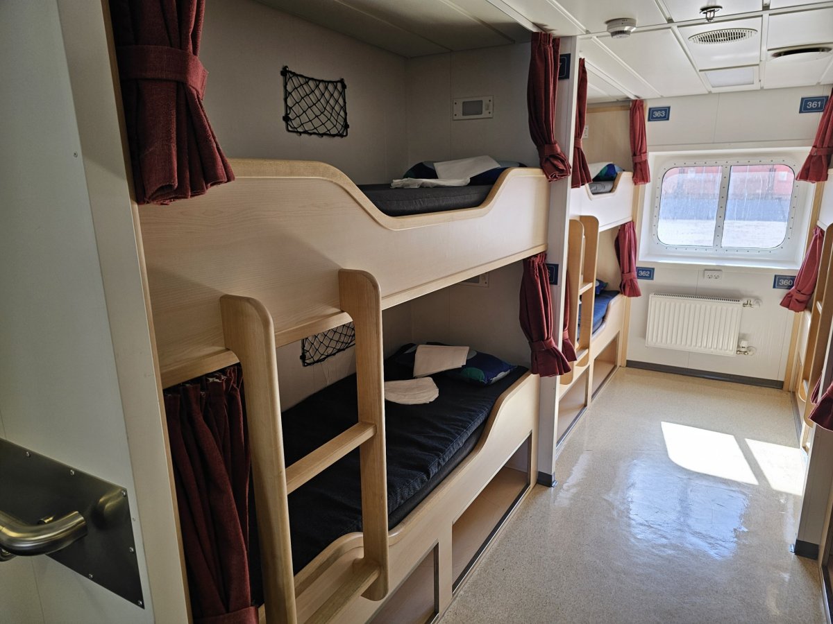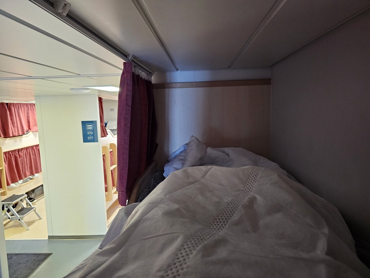 Matrace je však velmi pohodlná a i přes to, že jsem plul na konci května, kdy slunce po celou noc nezapadne za obzor, závěs u lehátka vytvořil dostatečnou tmu na to, abych usnul.