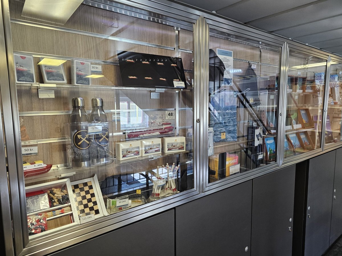V jídelně si můžete také zakoupit suvenýry s logem "Arctic Umiaq Line". Koupit můžete třeba propisky, kšiltovky nebo puzzle s obrázkem lodi Sarfaq Ittuk.