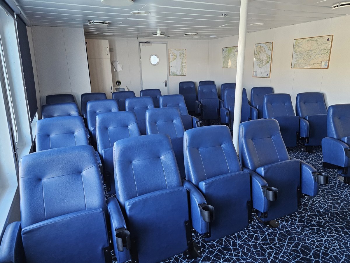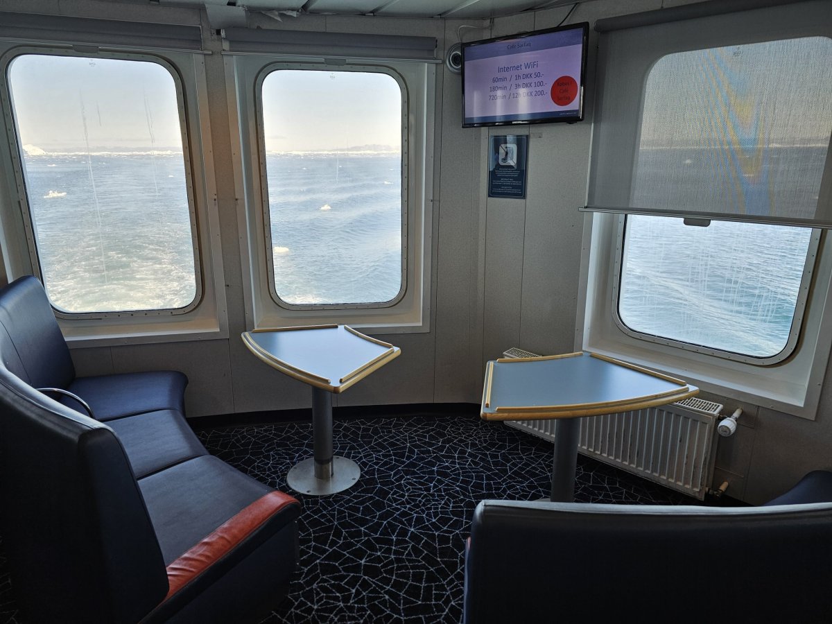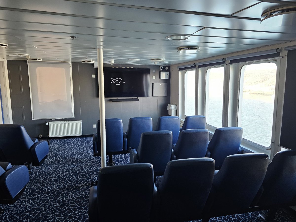 Vedle odpočinkové zóny na vnitřní palubě najdete také kinosál, kde se každý večer promítají filmy v dánštině nebo grónštině.