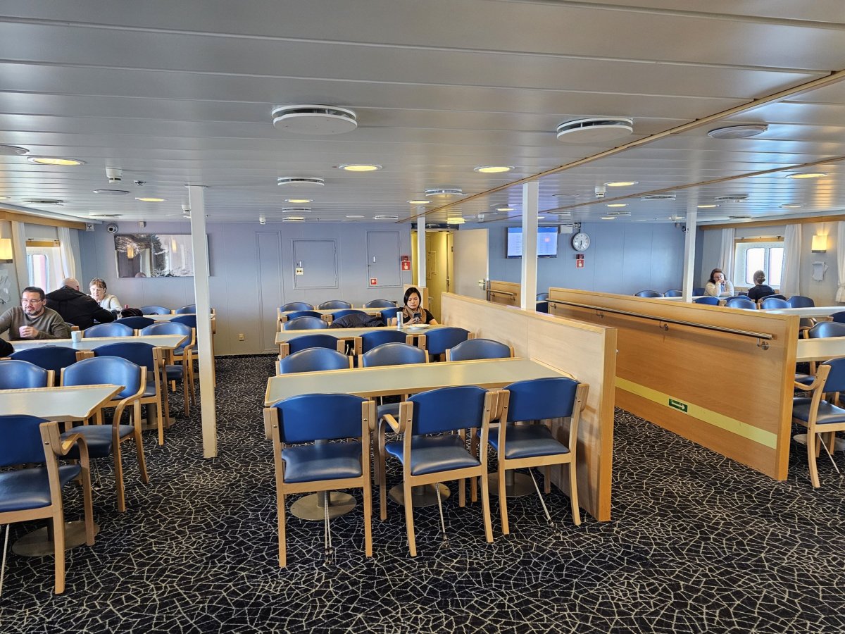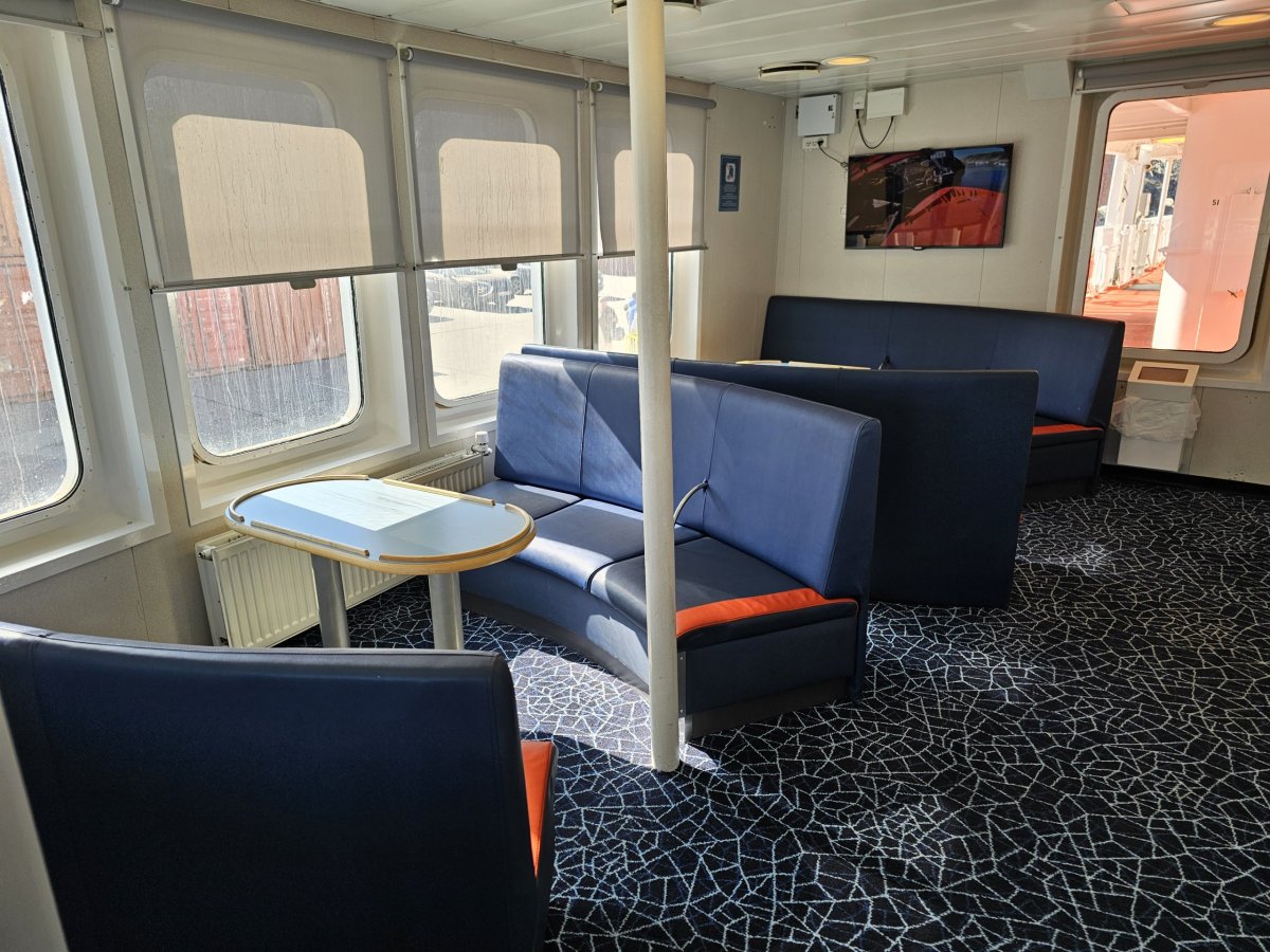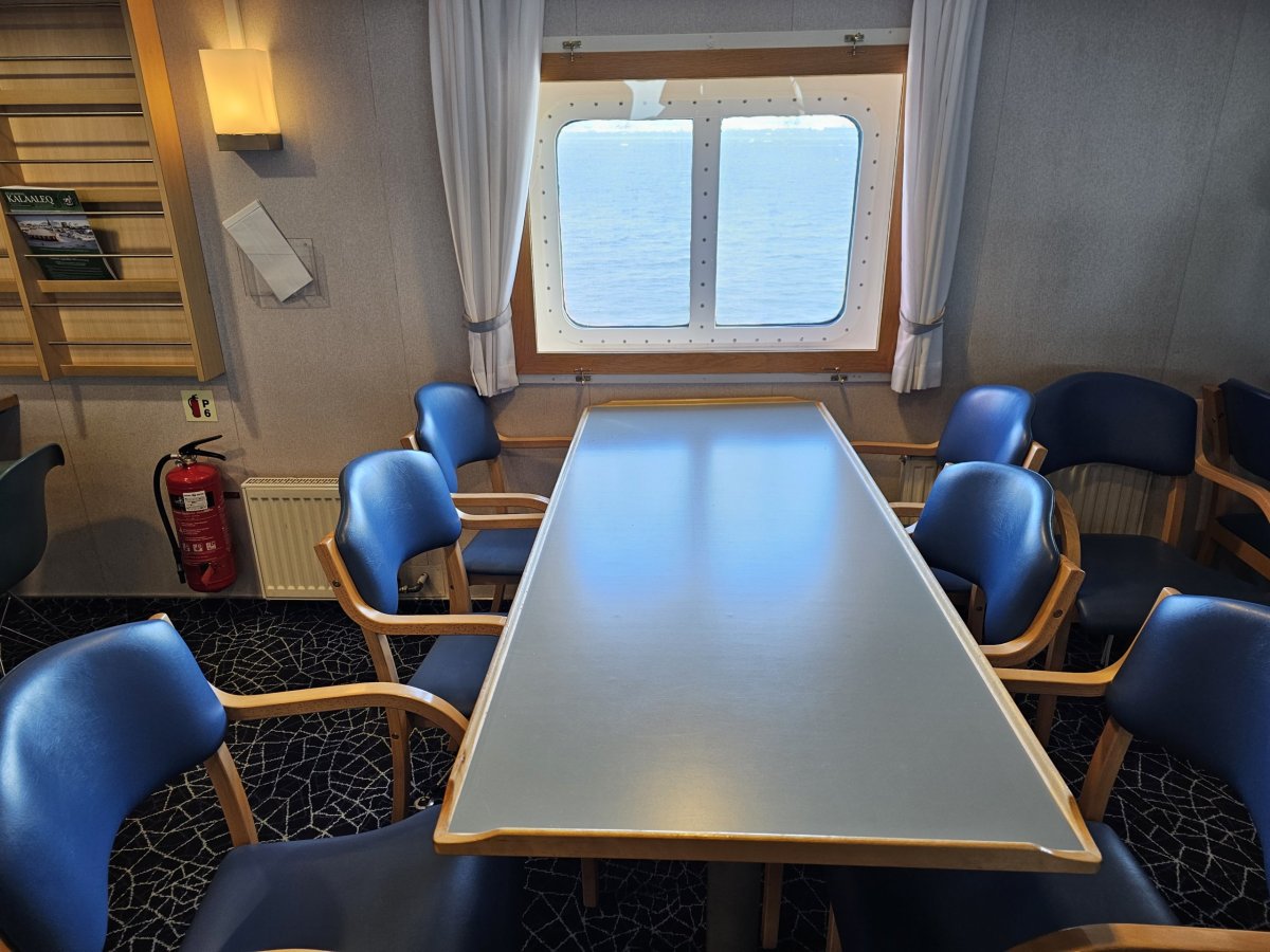 Vedle odpočinkové zóny na vnitřní palubě najdete také kinosál, kde se každý večer promítají filmy v dánštině nebo grónštině.