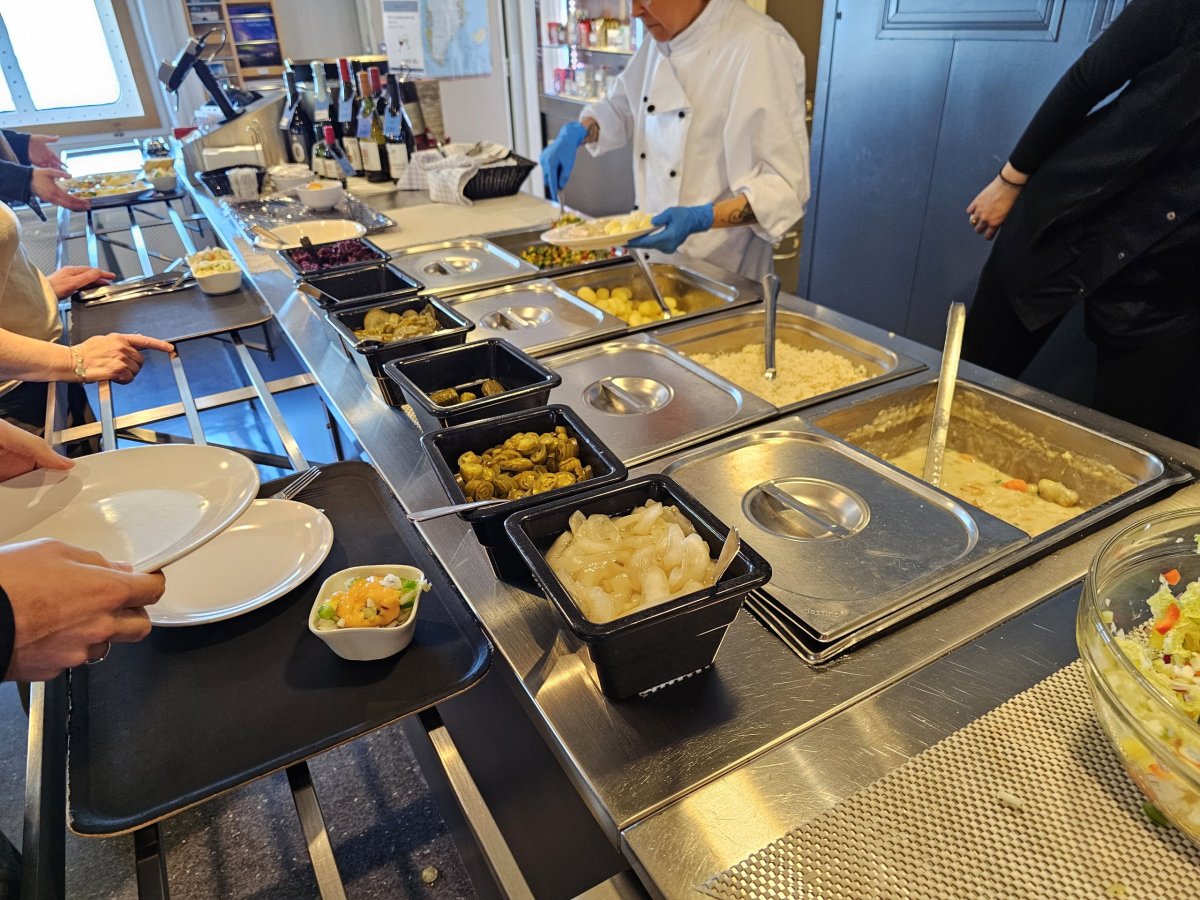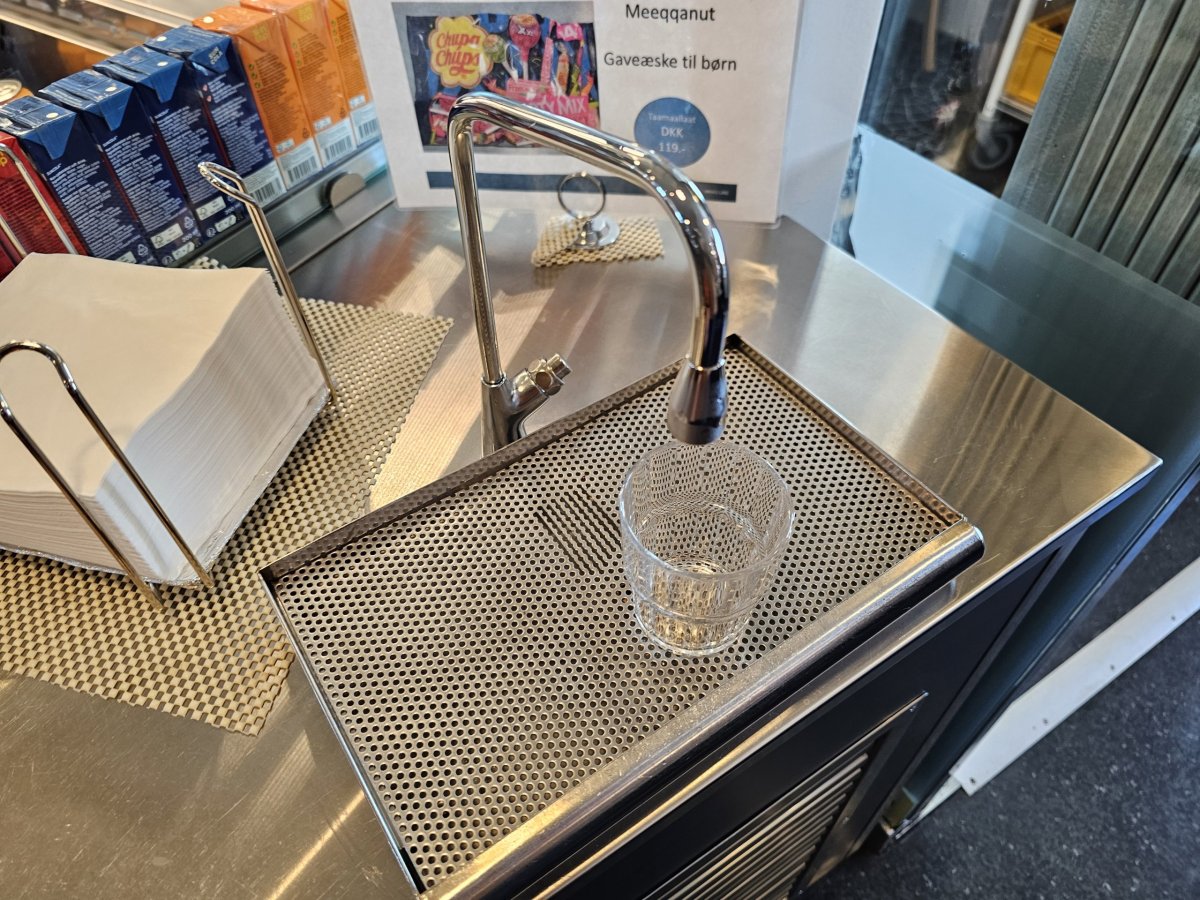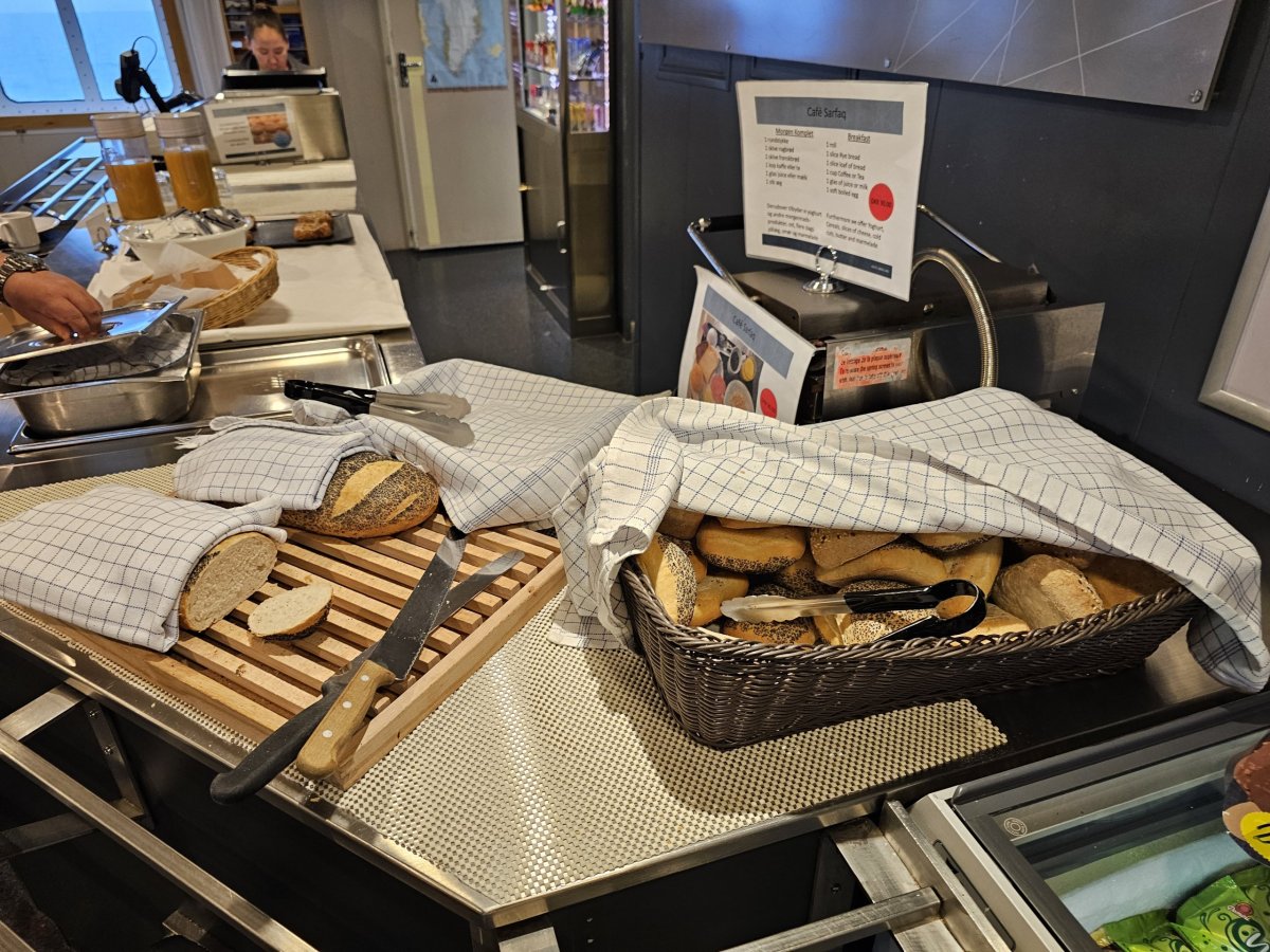 V Café Sarfaq si můžete kdykoliv od 7:00 do 22:00 zakoupit výborné smørrebrød (otevřené sendviče), bagety, kávu z automaty, sladkosti a další.