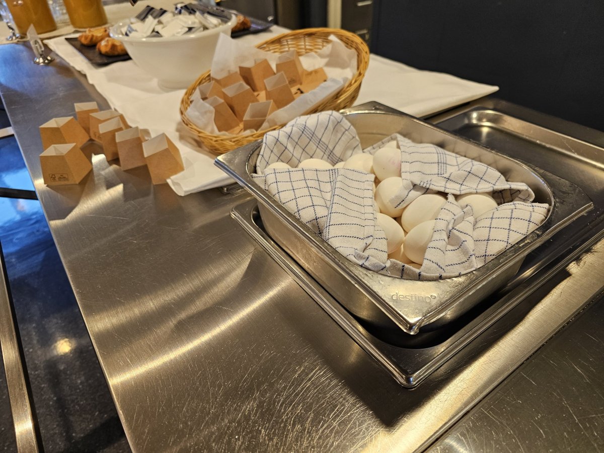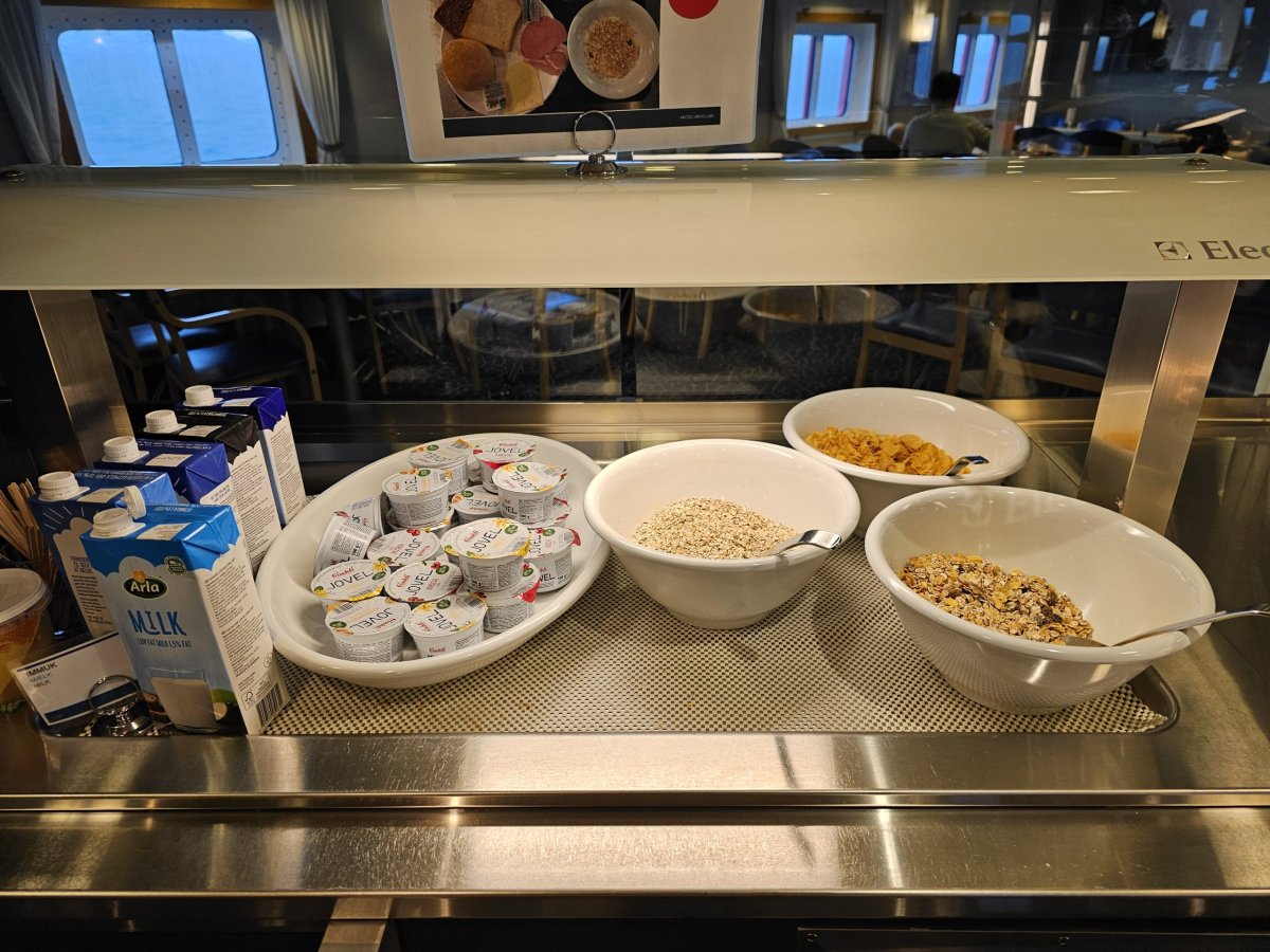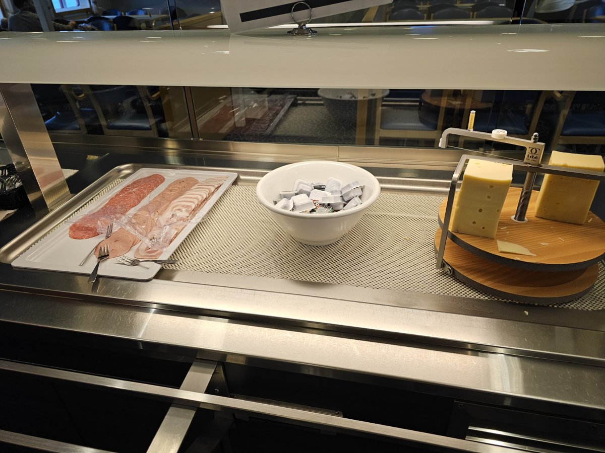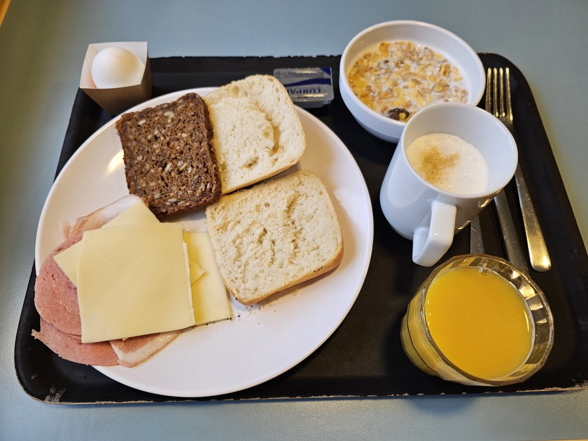 Vybrat si můžete 3 kusy pečiva, 1 jogurt, cereálie a dále několik druhů sýrů, šunky či salámů, kávu a džus. Snídani si můžete nabrat pouze 1x.