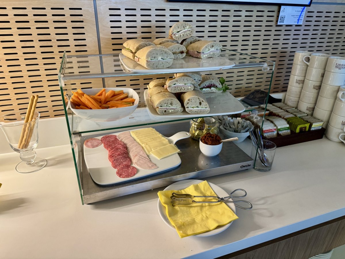 Půjdete-li do salónku s představou, že se plnohodnotně najíte, budete stejně jako my zklamáni. K dispozici je samoobslužný bar se sendviči a nápoji.