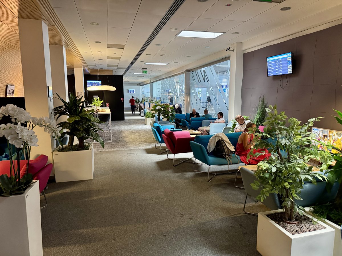 Salónek je zasazen do dlouhého úzkého prostoru s jednou boční prosklenou stěnou. Nejedná se tak o nic extra luxusního ani útulného, ale svůj účel plní - neslyšíte hluk z terminálu a máte se kam posadit.