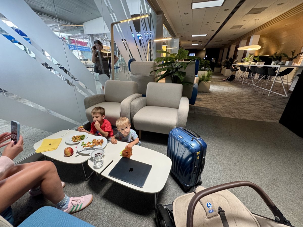 Vzhledem k faktu, že náš let postupně nabíral několikahodinové zpoždění, jsme jako hlavní jídlo dne pro děti museli řešit v letištní restauraci. To jsme si následně donesli do salónku a děti se v klidu mohly najíst.