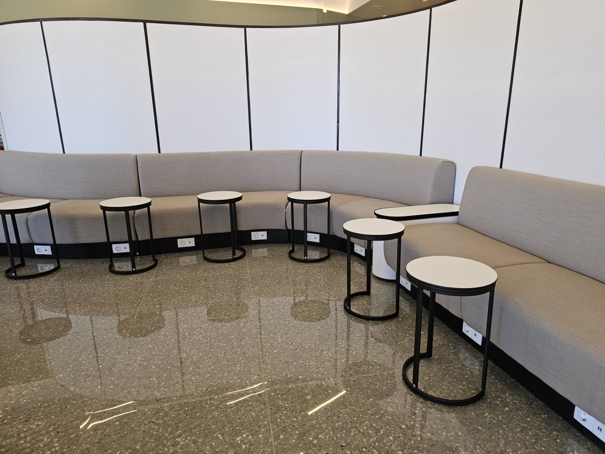 Podél oken jsou jídelní stolky a vlevo u zdi pak zvláštní polstrované lavice s malými stolky, u kterých upřímně moc nechápu účel. Pracovat se zde nedá a stolky jsou tak malé, že nejsou vhodné ani pro odkládání jídla nebo pití.