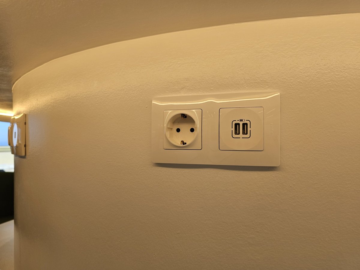 Zástrčky pro nabíjení elektroniky jsou k dispozici u většiny křesílek a všech pracovních ploch.