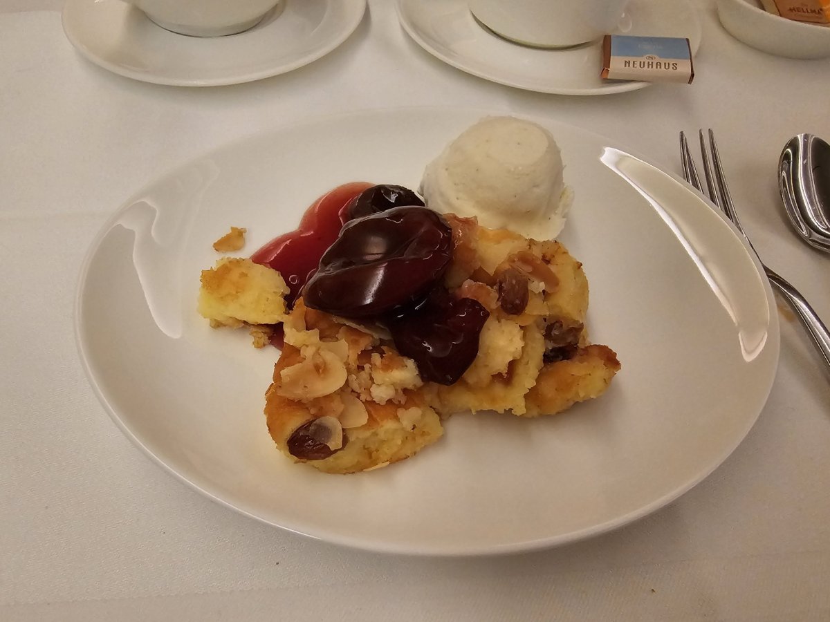 Miluji tradiční německý Kaiserschmarren. Tady ho dostávám se švestkou omáčkou a famózní vanilkovou zmrzlinou. Lepší císařský trhanec jsem snad ještě nejedl.