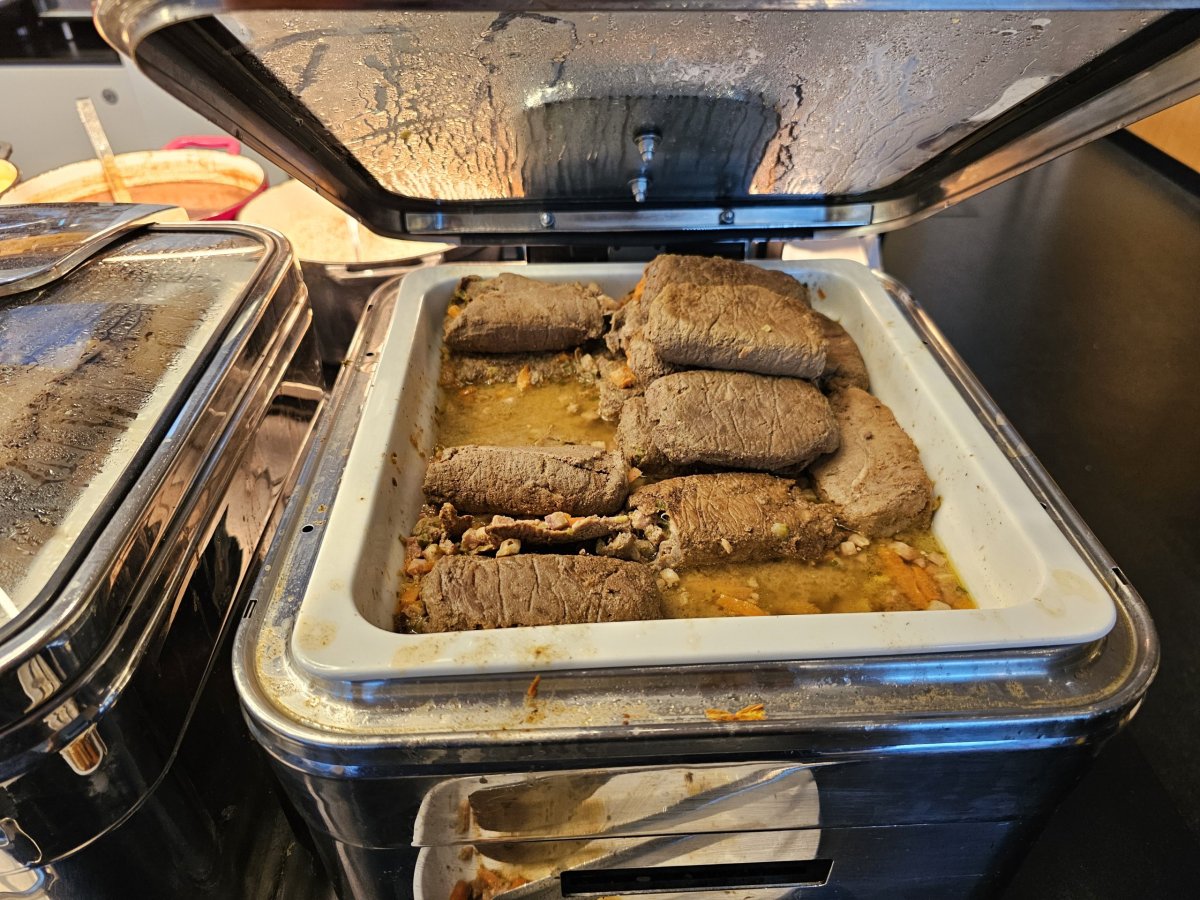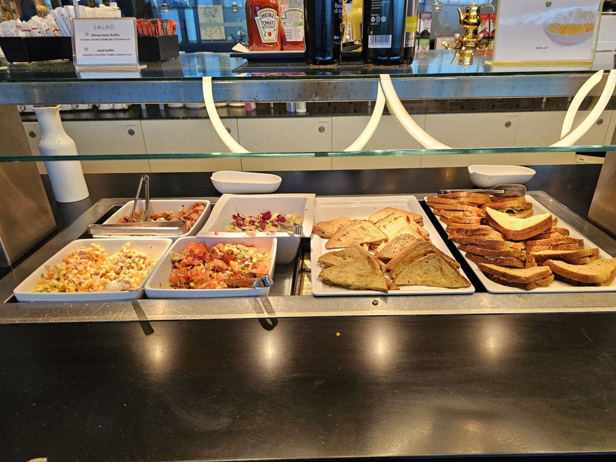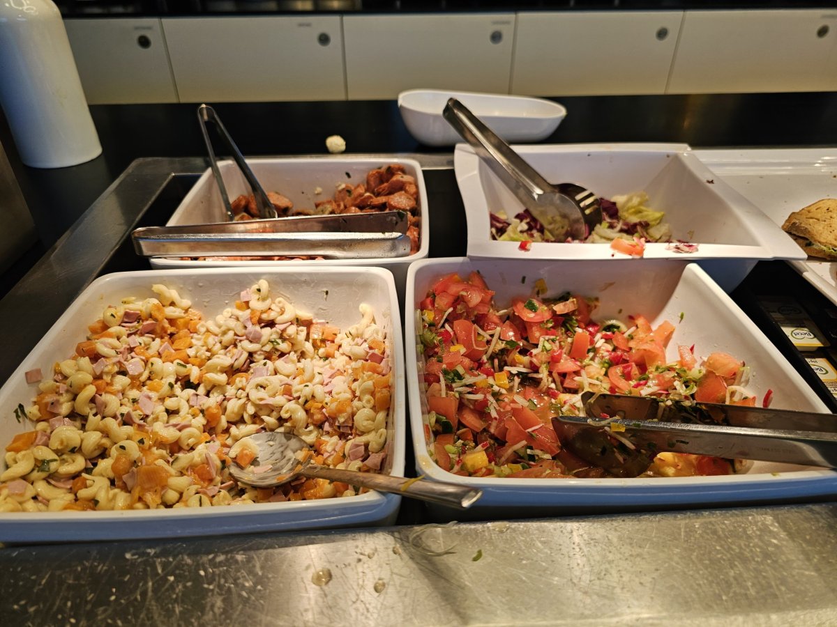 - Studená jídla – výběr z několika druhů salátů, sendvičů a pečiva. Kvalita nebyla moc valná a víc jsem si pochutnal na teplých jídlech