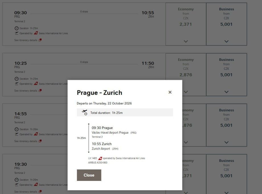 - Trasa: Curych ZRH – Praha (PRG)