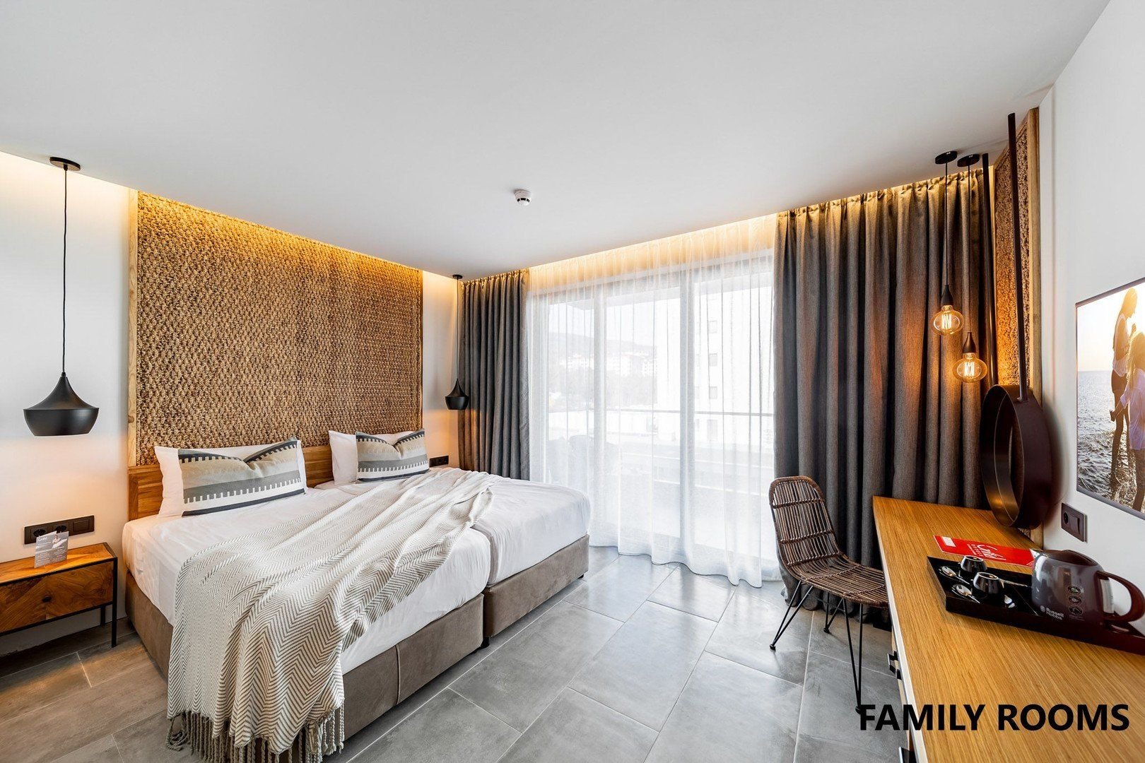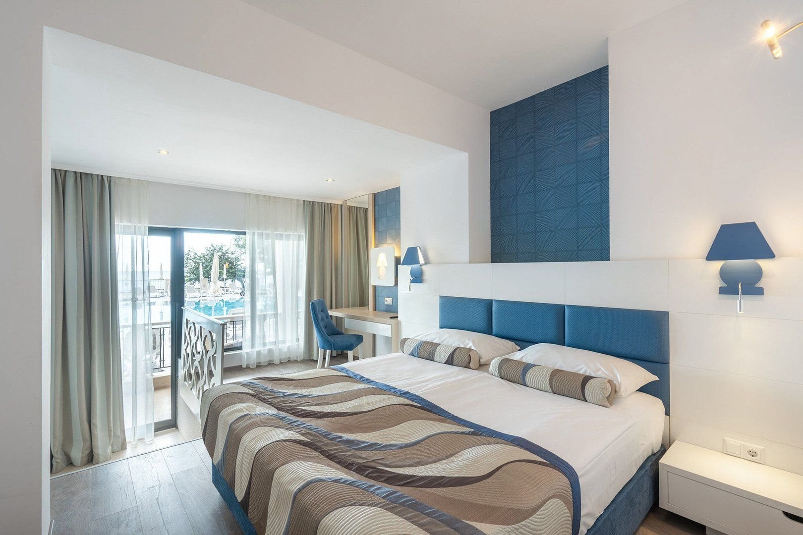 Dvoulůžkové pokoje s možností 1 přistýlky mají vlastní příslušenství (koupelna, vysoušeč vlasů, WC), klimatizace, multimediální TV, WiFi, telefon, minibar (denně doplňován), set na přípravu kávy a čaje, trezor (za poplatek), balkon s výhledem do okolí. Za příplatek výhled na moře.Za příplatek prostornější Superior pokoje s možností přistýlky s bočním výhledem na moře nebo rodinné pokoje s možností 2 přistýlek, za příplatek boční výhled na moře.Pokoj Concept pouze pro dospělé 16+s rozšířenými službami, blíže v Informace.Dětská postýlka zdarma.