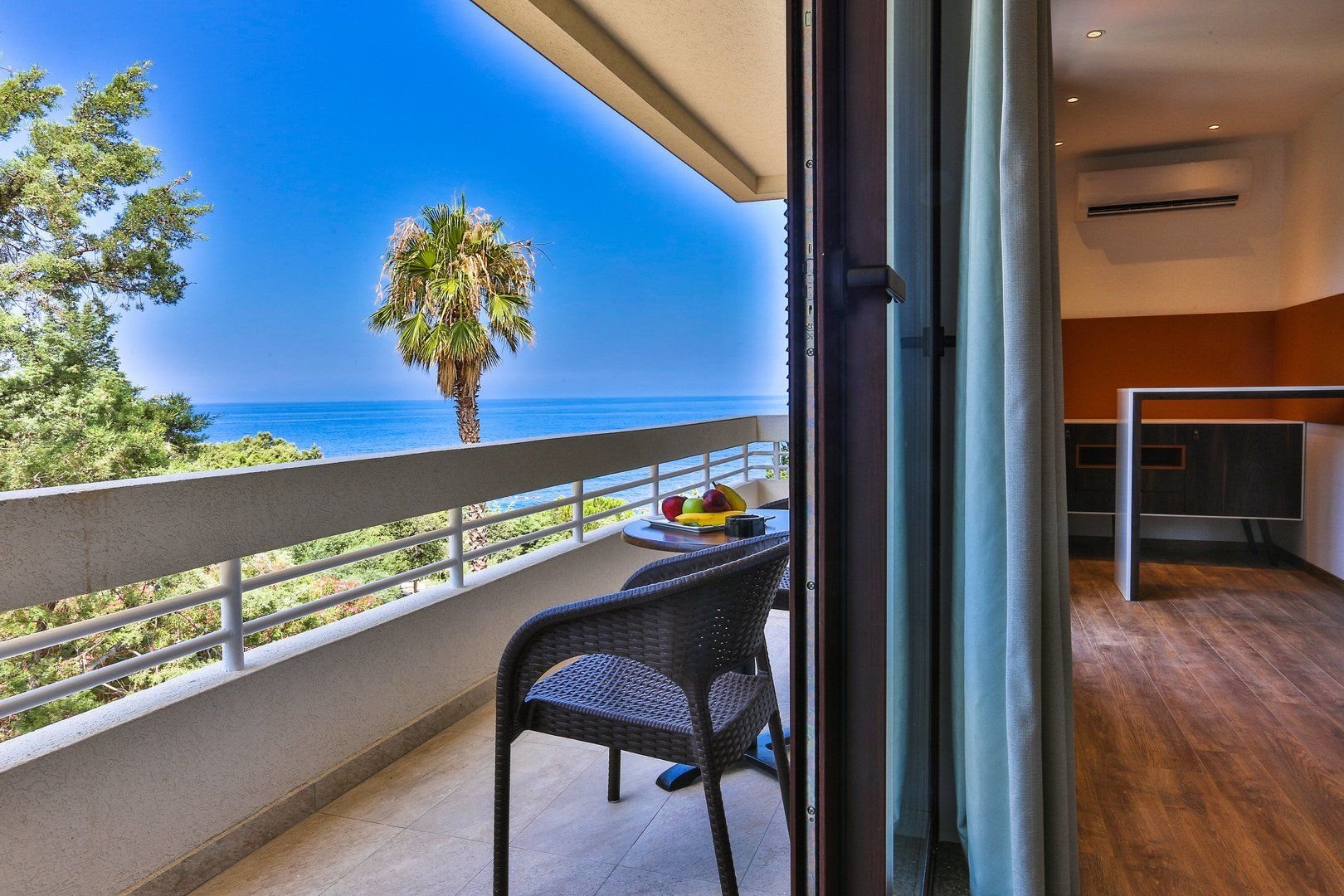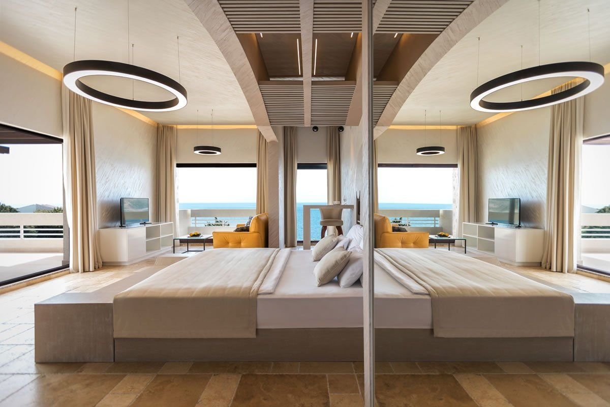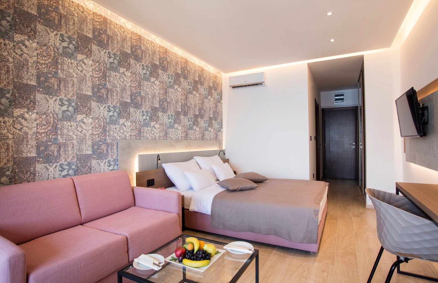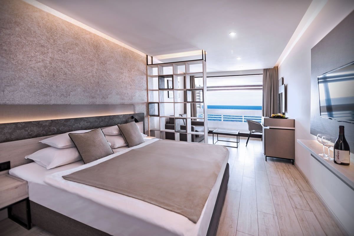 Dvoulůžkový pokoj s přistýlkou (35 m2) má vlastní soc. zařízení (sprcha), WC, klimatizace, TV, Wi-Fi, minibar, terasa.Junior Suita s výhledem na moře (45 m2) má vlastní soc. zařízení (sprcha), WC, klimatizace, TV, Wi-Fi, minibar, terasa.Rodinný apartmán (65 m2) má obývací pokoj, dvě oddělené ložnice, kuchyňka, vlastní soc. zařízení (vana), WC, TV, Wi-Fi, minibar, terasa.